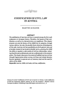 The codification of Austrian civil law is counted among the first such endeavours in European history. Therefore, the lessons of that codification, as well as its characteristics, are significant. This chapter presents not only the history of the ABGB from its adoption, through various reforms, but also the possible future direction of development of this code. Austrian civil law specifically sets forth general rules and principles instead of particularly detailed norms, granting the ABGB the ability to regulate a wide swathe of civil law relationships, including those between professionals and non-professionals in the economic sphere. The chapter documents the erosion of codified Austrian civil law through fragmentation (when various civil laws and related domains become regulated in separate acts of statutory law) and the need for reform of the ABGB.
