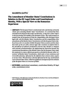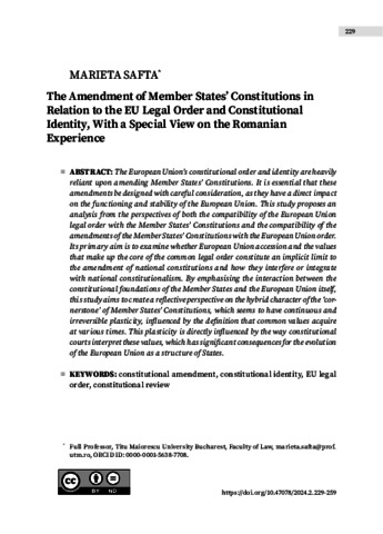 Safta, Marieta (2024) The Amendment of Member States’ Constitutions in Relation to the EU Legal Order and Constitutional Identity, With a Special View on the Romanian Experience. CENTRAL EUROPEAN JOURNAL OF COMPARATIVE LAW, 5 (2). pp. 229-259. ISSN 2732-0707