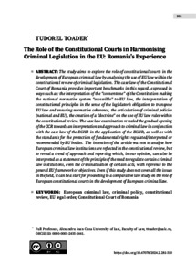 Toader, Tudorel (2024) The Role of the Constitutional Courts in Harmonising Criminal Legislation in the EU : Romania’s Experience. CENTRAL EUROPEAN JOURNAL OF COMPARATIVE LAW, 5 (2). pp. 281-310. ISSN 2732-0707