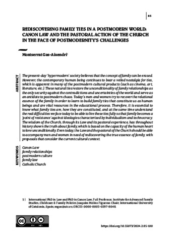 The present-day ‘hypermodern’ society believes that the concept of family can be erased. However, the contemporary human being continues to bear a veiled nostalgia for ties, which is apparent in many of the postmodern cultural products (such as cinema, art, literature, etc.). These natural ties restore the unconditionality of family relationships as the only security against the contradictions and uncertainties of the world and serve as an antidote to postmodern chaos. Today’s men and women try to recover the relational essence of the family in order to learn to build family ties that constitute us as human beings and are vital resources in the educational process. Therefore, it is essential to know what family ties are, how they are constituted, and at the same time understand the real difficulties we face today to be able to live these ties fully so that family becomes a ‘point of resistance’ against ideologies characterised by individualism and technocracy. The wisdom of the Church, through its Law and its pastoral experience, has throughout history shown the truth about family, which is based on the capacity of the human heart to love unconditionally. Even today, the Law and the pastoral of the Church should be able to accompany men and women in need of rediscovering the true essence of family, with proposals that consider the current cultural context.