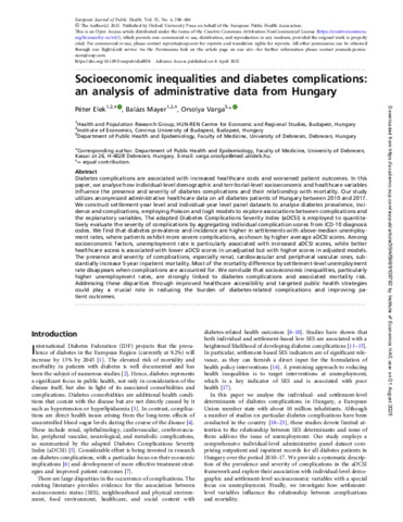 Elek, Péter and Mayer, Balázs and Varga, Orsolya (2025) Socioeconomic inequalities and diabetes complications : an analysis of administrative data from Hungary. EUROPEAN JOURNAL OF PUBLIC HEALTH, 35 (4). pp. 598-604. ISSN 1101-1262