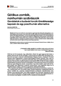 Bő ötven éve került elő a hazai régészet egyik legemblematikusabb leletegyüttese, a budavári gótikus szoborcsoport. Jelen tanulmány a korábbi, régészeti és művészettörténeti fókuszú kutatások többségével ellentétben, a szobrok töredékességét helyezi előtérbe. Ezen belül példákat hoz arra, hogy az eddigi múzeumi diskurzusban (ideértve a kiállításokat, tanulmányokat, művészeti interpretációkat) milyen módokon jelent meg a szobrok torzó jellege. Majd pedig, Bruno Latour munkásságára támaszkodva, megalapoz egy újszerű olvasatot is, amely a torzókat a kortárs műalkotásokkal, a poszthumanizmussal és végül az antropocénnel kapcsolja össze. | One of the most emblematic finds in Hungarian archaeology, the Gothic Buda Castle sculpture group, was discovered over fifty years ago. In contrast to most previous archaeological and art history-focused research, this study emphasizes the fragmentary nature of the sculptures, while also providing examples of the ways in which the torso nature of sculptures has appeared in museum discourse (including exhibitions, studies, and artistic interpretations) to date. Inspired by the work of Bruno Latour, the author also establishes a novel reading that connects torsos to contemporary artworks, post-humanism, and ultimately the Anthropocene.