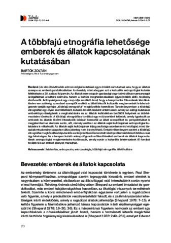 Az elmúlt évtizedek antrozoológiai kutatásai egyre inkább rámutatnak arra, hogy az állatokszerepe az emberi gondolkodásban fontosabb, mint ahogyan azt a kulturális antropológiai kutatásfeltételezte a 20. század folyamán. Az állatok nem csupán gazdasági vagy szimbolikus nyersanyagotszolgáltatnak a kultúra számára, hanem a kultúra meghatározásában egyre inkább aktív, tevékenyrésztvevők. Antropológusok egy csoportja amellett érvel, hogy a terepmunka fókuszának kiszélesítésére van szükség: az emberi szereplők mellett az állati létezők kulturális megismerését is lehetségesnek tartják egyfajta „többfajú etnográfiai” megközelítés keretében. Tanulmányomban a többfajúetnográfiát egy olyan szemléletként, kutatói érdeklődésként értelmezem, amely az eddigi kutatásokemberközpontúságának a meghaladására és az állatok kultúrákban betöltött helyének az átértelmezésére törekszik. A többfajú etnográfiára továbbá egy módszerként tekintek, amely igyekszik azemberek és állatok közötti interakciók leírásán keresztül az állati szereplőket és perspektívákat ismegjeleníteni az elemzés során, sőt, némely esetben az állatok saját kultúrájának antropológiai kutatására is vállalkozik. Az állatok saját kultúrájának létjogosultsága azonban mind etológiai, mind társadalomtudományi alapokon állva jelenleg nem bizonyítható. Emiatt véleményem szerint a többfajúetnográfiai megközelítés képviselete során jelentkező ismeretelméleti problémák kiküszöbölése csakúgy lehetséges, ha a terepen kutató antropológusok erőfeszítéseiket emberek és állatok kapcsolatának antropológiai megismerésére korlátozzák, amely során a kulturális értelmezések fő forrásaitovábbra is az emberi alanyok maradnak. | Anthrozoological research in recent decades has increasingly highlighted that the role of animals in human thought is more important than cultural anthropologists assumed during the 20th century. Animals do not merely provide economic or symbolic ‘raw materials’ for culture, but are increasingly active participants in the definition of culture. A group of anthropologists argues that the focus of fieldwork needs to be broadened, i.e. they believe that cultural understanding of animals, in addition to that of human actors, is also possible within the framework of a kind of ‘multi-species ethnographic approach’. In my study, I interpret multi-species ethnography as a perspective and research interest that seeks to transcend the anthropocentricity of previous research and to reinterpret the place of animals in cultures. Furthermore, I view multi-species ethnography as a method that seeks to include animal actors and perspectives in the analysis through the description of human-animal interactions, and in some cases even undertakes anthropological research into the animals’ own culture. However, the existence of animals’ own culture cannot currently be proven on either ethological or social science grounds. For this reason, in my opinion, the epistemological problems that arise when applying a multi-species ethnographic approach can only be eliminated if field anthropologists limit their efforts to the anthropological understanding of the human-animal relations, and in doing so, human subjects remain the main sources of cultural interpretations.