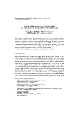 Gyöngyösi, Szilvia and Juhász, Laura and Barkóczy, Péter and Cseh, Julianna (2019) Surface Phenomena and the Results of Chemical Analysis of Bronze Artefacts. Materials Science and Engineering, 44 (2). pp. 23-31. ISSN 2063-6792