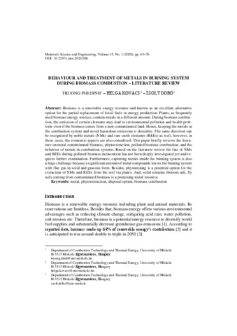Truong, Phi Dinh and Kovács, Helga and Dobó, Zsolt (2020) Behavior and Treatment of Metals in Burning System During Biomass Combusion – Literature Review. Materials Science and Engineering, 45 (1). pp. 63-76. ISSN 2063-6792