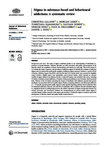 Galanis, Christina and Leske, Morgan and Hamamura, Toshitaka and Weber, Nathan and Hing, Nerilee and Delfabbro, Paul H. and King, Daniel L. (2025) Stigma in substance-based and behavioural addictions: A systematic review. JOURNAL OF BEHAVIORAL ADDICTIONS, 14 (1). pp. 79-99. ISSN 2062-5871 (print); 2063-5303 (online)