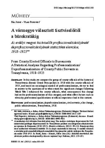 Pál, Judit and Vlad, Popovici (2025) A vármegye választott tisztviselőitől a bürokratákig : Az erdélyi megyei tisztviselők professzionalizációjának/deprofesszionalizációjának statisztikai elemzése, 1918–1925. REGIO: KISEBBSÉG KULTÚRA POLITIKA TÁRSADALOM, 33 (2). pp. 183-219. ISSN 0865-557X