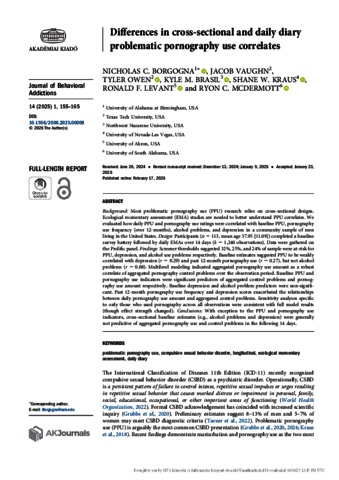 Borgogna, Nicholas C. and Vaughn, Jacob and Owen, Tyler and Brasil, Kyle M. and Kraus, Shane W. and Levant, Ronald F. and McDermott, Ryon C. (2025) Differences in cross-sectional and daily diary problematic pornography use correlates. JOURNAL OF BEHAVIORAL ADDICTIONS, 14 (1). pp. 155-165. ISSN 2062-5871