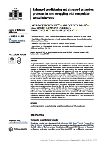 Wojciechowski, Jakub and Draps, Malgorzata and Kublik, Ewa and Dubiejko, Paulina and Wolak, Tomasz and Gola, Mateusz (2025) Enhanced conditioning and disrupted extinction processes in men struggling with compulsive sexual behaviors. JOURNAL OF BEHAVIORAL ADDICTIONS, 14 (1). pp. 191-203. ISSN 2062-5871
