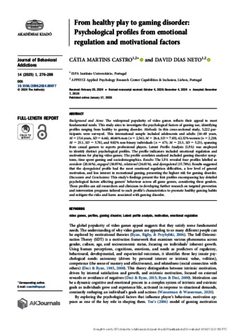 Castro, Catia Martins and Neto, David Dias (2025) From healthy play to gaming disorder: Psychological profiles from emotional regulation and motivational factors. JOURNAL OF BEHAVIORAL ADDICTIONS, 14 (1). pp. 276-288. ISSN 2062-5871
