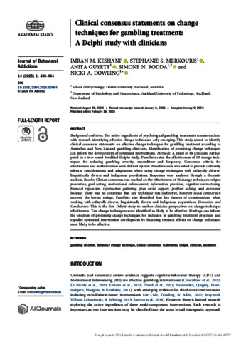 Keshani, Imran M. and Merkouris, Stephanie S. and Guyett, Anita and Rodda, Simone N. and Dowling, Nicki A. (2025) Clinical consensus statements on change techniques for gambling treatment: A Delphi study with clinicians. JOURNAL OF BEHAVIORAL ADDICTIONS, 14 (1). pp. 430-444. ISSN 2062-5871