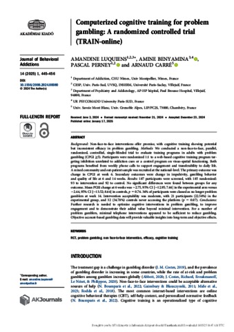 Luquiens, Amandine and Benyamina, Amine and Perney, Pascal and Carré, Arnaud (2025) Computerized cognitive training for problem gambling: A randomized controlled trial (TRAIN-online). JOURNAL OF BEHAVIORAL ADDICTIONS, 14 (1). pp. 445-456. ISSN 2062-5871