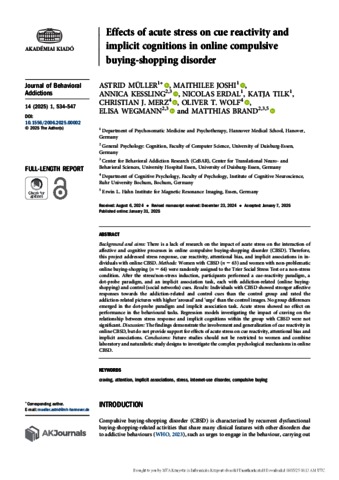 Mueller, Astrid and Joshi, Maithilee and Kessling, Annica and Erdal, Nicolas and Tilk, Katja and Merz, Christian J. and Wolf, Oliver T. and Wegmann, Elisa and Brand, Matthias (2025) Effects of acute stress on cue reactivity and implicit cognitions in online compulsive buying-shopping disorder. JOURNAL OF BEHAVIORAL ADDICTIONS, 14 (1). pp. 534-547. ISSN 2062-5871