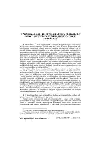 In the Carpathian Basin, names incorporating a lexeme meaning ‘German’ form one of the largest groups of Old Hungarian settlement names that refer to ethnicity. Most of the observed names include the ethnic names német ‘German’ and szász ‘Transylvanian Saxon’. The paper examines the relevant toponyms, adopting several distinct geolinguistic points of view, and analyses the structural composition of the various morphological types (i.e. names of one or two constituents), presenting the role of the different name components in the name forms. Furthermore, the author examines the extent to which the regular linguistic research of settlement names contributes to ethnic reconstruction, a question that has been discussed in historical inquiries for almost a hundred years.