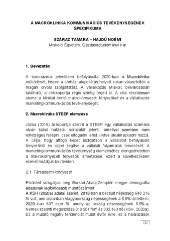 A koronavírus jelentősen befolyásolta 2020-ban a Macroklinika működését, hiszen a kórházi alapellátás helyett sokan választották a magán orvosi szolgáltatást. A vállalkozás Miskolc belvárosában található, a célcsoportja régió szintig terjed ki. A cikk részletesen elemzi a klinikát érintő makrokörnyezeti tényezőket és a vállalkozás marketingkommunikációs tevékenységét