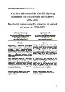 Magyarországon a létfontosságú rendszerelemek védelmére vonatkozó szabályozás már több, mint tíz éve speciális szabályokat állapít meg a kijelölt gazdálkodó szervezetek egyes infrastruktúra-elemeinek üzemfolytonos működése érdekében. A biztonsági környezet változása, a koronavírus világjárvány, a technikai-technológiai fejlődés, továbbá a kockázatok mellett a fenyegetettség megjelenés fokozott intézkedéseket igényelt szövetségesi, európai és nemzeti szinten egyaránt.Ennek eredményeként jelentek meg a NATO-nak a polgári felkészültség alapkövetelményei, a kritikus entitások rezilienciájáról szóló EU irányelv és Magyarországon a kritikus szervezetekre vonatkozó új jogszabályok. A szerzők a jelen cikkben ismertetik a szabályozási környezet változásának jelentősebb pontjait a nemzetközi jogi környezet és a hazai jogszabályok bevezetésének mérföldköveit. | n Hungary, the regulation on the protection of the elements of the essential services has been establishing special rules for more than ten years in order to ensure the continuous operation of the designated organizations. The change in the security environment, the coronavirus pandemic along with technical and technological developments, and the emergence of threats in addition to risks have required increased measures on the allied, European and national levels. As a result, NATO's basic requirements for civil preparedness, the EU Directive on the resilience of critical entities and, new legislation on critical entities in Hungary, have been published. In this article, the authors describe the most significant points of the change in the regulations and the milestones of the introduction of the international legal environment and of the Hungarian member state legislation.