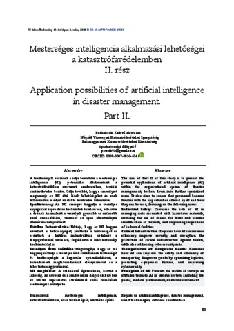 A tanulmány II. részének a célja bemutatni a mesterséges intelligencia (MI) potenciális alkalmazásait a katasztrófavédelem szervezeti rendszerében, további szakterületekre bontva. Célja továbbá, hogy a személyzet megismerje az MI által kínált lehetőségeket és azok felhasználási módjait az alábbi területekre fókuszálva:Iparbiztonság: Az MI szerepét tárgyalja a veszélyes anyagokkal kapcsolatos kockázatok kezelésében, beleértve a drónok használatát a veszélyek gyorsabb és szélesebb körű azonosítására, valamint az ipari létesítmények ellenőrzésének javítását.Kritikus Infrastruktúra: Feltárja, hogy az MI hogyan növelheti a hatékonyságot, javíthatja a biztonságot és erősítheti a kritikus infrastruktúra védelmét a fenyegetésekkel szemben, foglalkozva a kiberbiztonsági kockázatokkal is.Veszélyes Áruk Szállítása: Megvizsgálja, hogy az MI hogyan javíthatja a veszélyes áruk szállításának biztonságát és hatékonyságát a logisztika optimalizálásával, a berendezések meghibásodásának előrejelzésével és a kiberbiztonság javításával.MI megítélése: A különböző ágazatokban, köztük a lakosság, az orvosok és a rendvédelmi dolgozók körében az MI-vel kapcsolatos attitűdökről szóló felmérések eredményeit mutatja be. | The aim of Part II of this study is to present the potential applications of artificial intelligence (AI) within the organizational system of disaster management, broken down into further specialized areas. It also aims to ensure that personnel become familiar with the opportunities offered by AI and how they can be used, focusing on the following areas: Industrial Safety: Discusses the role of AI in managing risks associated with hazardous materials, including the use of drones for faster and broader identification of hazards, and improving inspections of industrial facilities. Critical Infrastructure: Explores how AI can increase efficiency, improve security, and strengthen the protection of critical infrastructure against threats, while also addressing cybersecurity risks. Transportation of Dangerous Goods: Examines how AI can improve the safety and efficiency of transporting dangerous goods by optimizing logistics, predicting equipment failures, and improving cybersecurity. Perception of AI: Presents the results of surveys on attitudes towards AI in various sectors, including the public, medical professionals, and law enforcement.