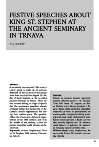 A previously unexamined 18th century source group is made up of sermons delivered on the occasion of the annual main feast was held on August 20, the day of Saint Stephen, in the so-called Ancient Seminary in Trnava. These festive sermons belong to a type of speech that the seminarian preachers already prepared within the framework of the Catholic church organization, but during their student years. The speeches follow the Ciceronian rhetorical expectations of the 18th century, and from the middle of the century, a slow departure from this world of taste can be observed. | Článok sa zaoberá doteraz nepreskúmaným súborom kázní z 18. storočia. Tieto boli čítané 20. augusta, na deň sv. Štefana v tzv. Starom seminári v Trnave. Kázne majú slávnostný charakter. Pripravili ich kňazi zo spomínaného seminára podľa vtedajšej katolíckej praxe, vykazujú však znaky študentských prác. Kázne sú koncipované v duchu cicerónskej rétoriky typickej pre 18. storočie, avšak kázne z 2. polovice 18. storočia už vykazujú odklon od tohto štýlu.