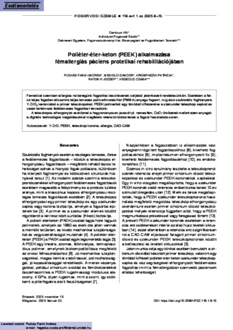 Puskás, Fanni Andrea and Miskolci, Sándor and Krompaszki, Patrícia and Rátonyi, József and Hegedűs, Csaba (2025) Poliéter-éter-keton (PEEK) alkalmazása fémallergiás páciens protetikai rehabilitációjában [Prosthetic rehabilitation of a metal-allergic patient using polyetheretherketone (PEEK)]. FOGORVOSI SZEMLE, 118 (1). pp. 8-13. ISSN 0015-5314