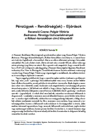 Kovács, Tamás (2025) Pénzügyek – Rendőrség(ek) – Eljárások : Recenzió Czene-Polgár Viktória Beárazva. Pénzügyi bűncselekmények a Rákosi-korszakban című könyvéről. MAGYAR RENDÉSZET, 25 (1). pp. 241-243. ISSN 1586-2895