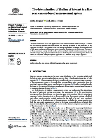 Forgács, Zsófia and Trohák, Attila (2025) The Determination of the Line of Interest in a Line Scan Camera-Based Measurement System. POLLACK PERIODICA: AN INTERNATIONAL JOURNAL FOR ENGINEERING AND INFORMATION SCIENCES, 20 (2). pp. 113-118. ISSN 1788-1994