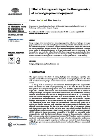 Lévai, Emese and Bereczky, Ákos (2025) Effect of hydrogen mixing on the flame geometry of natural gas-powered equipment. POLLACK PERIODICA: AN INTERNATIONAL JOURNAL FOR ENGINEERING AND INFORMATION SCIENCES, 20 (2). pp. 119-123. ISSN 1788-1994