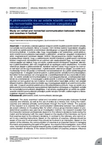 A tanulmány a labdarúgásban dolgozó edzők és játékvezetők közötti verbális, nonverbális kommunikációt, illetve a mosolyt, mint mimikai eszköz használatát vizsgálta. Az edzők és a játékvezetők a mérkőzésen elsődlegesen a negyedik játékvezetőn keresztül kommunikálnak. A kutatás célja, hogy megvizsgálja a két szakember (edző-játékvezető) közötti kommunikációs kapcsolatot a játéktéren, amelyhez vizsgálati módszerként előre meghatározott kérdések alapján történő fókuszcsoportos interjút használtunk. A kutatásunkban kiderült, hogy a szakemberek közötti interakció a játékvezető mérkőzés közben meghozott döntéseitől és az edzővel való viselkedésétől függ. Az interjúk eredményei alapján azt találtuk, hogy az edzők, a játékvezetői döntésekre reagálnak, ellentétben a játékvezetőkkel, akik nem reagálhatnak az esetleges edzői utasításokra. Az edzők véleménye alapján a játékvezetőknek, tisztában kell lenni azzal, hogy hogyan és mennyire kell részt vennie egy interakcióban. A játékvezetők véleménye alapján, az edzők kommunikációja fontos tényezője a mérkőzés menedzselésének és a játék szellemiségének megőrzésének. A vizsgálat eredményeként, a játékvezetők verbális kommunikációjában, kiemelten fontos szerepe van a hangsúlynak, a szakkifejezéseknek és a racionális érvelésnek. Az edzők verbális kommunikációjában a nyomásgyakorlásnak, a befolyásolási kísérletnek és a bíztatásnak. A mosolygást a játékvezetők a cinizmus kifejezésére használják, azonban ez nem gyakori és nem tudatos. Az edzők akkor használják, amikor nem akarják kifejezni őszinte véleményüket és inkább egy mosolygással zárják le az adott kommunikációs vitát. A kapott eredményekből arra a következtetésre jutottunk, hogy az edzők és a játékvezetők kommunikációs kapcsolatának fejlődéséhez szükséges a megfelelő verbális és nonverbális kommunikáció elsajátítása. A tanulmány segítségével, az edzők és a játékvezetők közötti kommunikációt próbáljuk pozitív irányba formálni, ezáltal segítve a labdarúgásban végzett munkájukat. | The study examined verbal and nonverbal communication between football coaches and referees, as well as the use of smiles as a mimicry tool. During the match, coaches and referees primarily communicate through the fourth referee. The purpose of the research is to examine the communication relationship between two professionals (coach-referee) on the playing field, for which a focus group interview based on predetermined questions was used as an investigation method. Our research revealed that the interaction between professionals depend on the referee’s decisions made during the match and his behaviour with the coach. Based on the results of the interviews, we found that coaches react to the referee’s decisions, in contrast to the referees, who cannot react to any coaching instructions. Based on the opinions of coaches, referees should be aware of how and to what extent they should be involved in an interaction. Based on the opinion of the referees, the communication of coaches is an important factor in managing the match and preserving the spirit of the game. As a result of the investigation, tone of the voice, technical terms and logical reasoning play a particularly important role in the verbal communication of referees. In the verbal communication of coaches, pressure, influence and encouragement are used by referees to express cynicism, but this is not common and not conscious. Coaches use it when they don’t want to express their honest opinion and prefer to end the given communication discussion with a smile. From the obtained results, we came to the conclusion that the development of the communication relationship between coaches and referees requires the acquisition of appropriate verbal and nonverbal communication. With the help of this study, we are trying to shape the communication between coaches and referees in a positive direction, thereby helping their work in football.