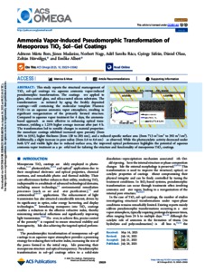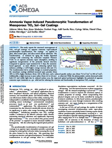 Bors, Adrienn Márta and Madarász, János and Nagy, Norbert and Rácz, Adél Sarolta and Sáfrán, György and Olasz, Dániel and Hórvölgyi, Zoltán and Albert, Emőke (2025) Ammonia Vapor-Induced Pseudomorphic Transformation of Mesoporous TiO2 Sol-Gel Coatings. ACS OMEGA, 10 (31). pp. 35029-35042. ISSN 2470-1343