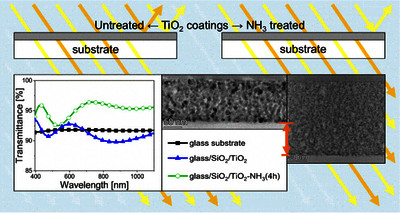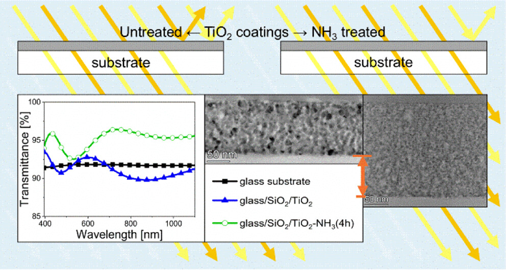 This study reports the structural rearrangement of TiO2 sol–gel coatings via aqueous ammonia vapor-induced pseudomorphic transformation. The coatings were applied to glass, silica-coated glass, and silica-coated silicon substrates. The transformation was initiated by aging the freshly deposited coatings─still containing the molecular template Pluronic P123─in an aqueous ammonia vapor atmosphere, resulting in significant reorganization of the primarily formed structure. Compared to aqueous vapor treatment for 4 days, the ammonia-based approach was more effective in enhancing optical transmittance, yielding a 1.25% higher average increase after just 4 h. The transformation led to notable changes in material properties: the monolayer coatings exhibited increased open porosity (from 38% to 55%), higher thickness (from 130 to 205 nm), and a reduced specific surface area (from 713 m2/cm3 to 392 m2/cm3). Additionally, a slight increase in pore radius (from 5.6 to 6.6 nm) was observed. While the photocatalytic activity decreased under both UV and visible light due to reduced surface area, the improved optical performance highlights the potential of aqueous ammonia vapor treatment as a powerful tool for tailoring the structure and functionality of mesoporous TiO2 coatings.