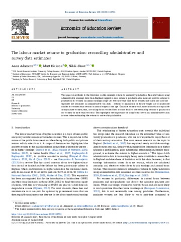 Adamecz-Völgyi, Anna and Dickson, Matt and Shure, Nikki (2025) The labour market returns to graduation : reconciling administrative and survey data estimates. ECONOMICS OF EDUCATION REVIEW, 108. No.-102701. ISSN 0272-7757