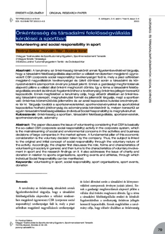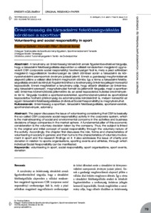 A tanulmány az önkéntesség témakörét annak figyelembevételével tárgyalja, hogy a társadalmi felelősségvállalás alapvetően a vállalati rendszerben megjelenő úgynevezett CSR (corporate social responsibity) tevékenységet fedi le, mely a piaci szférában megjelenő nagyvállalatok tevékenységei és üzleti döntései során a társadalmi és környezetvédelmi szempontok érvényre jutását jelenti. Ennek a gazdasági megfontolásnak alapvető pillére a vállalat által önként meghozott döntés. Így a téma a társadalmi felelősségvállalás eredeti és kiinduló fogalomköréhez a tevékenység önkéntes jellegén keresztül kapcsolódik. Ennek megfelelően a tanulmány célja, hogy először általában az önkéntesség társadalmi szerepét, megnyilvánulási formáit és jellemzőit tárgyalja, majd a sportban való önkéntes közreműködés jellemzőire és az azzal kapcsolatos kutatási eredményekre tér ki. Tárgyalja további a sportszervezetekkel, sportrendezvényekkel és sportolókkal kapcsolatba hozható jótékonyság és adományozás kérdéskörét is, melyen keresztül az egyén társadalmi felelősségvállalása (Individual Social Responsibility) is megnyilvánulhat. | The paper discusses the issue of volunteering considering that CSR is basically the so-called CSR (corporate social responsibility) activity in the corporate system, which is the mainstreaming of social and environmental concerns in the activities and business decisions of large companies in the market sphere. A fundamental pillar of this economic consideration is the voluntary decision taken by the company. Thus, the subject is linked to the original and initial concept of social responsibility through the voluntary nature of the activity. Accordingly, the chapter first discusses the role, forms and characteristics of volunteering in society in general, and then turns to the characteristics of voluntary involvement in sport and the research findings on it. It also addresses the issue of charity and donation in relation to sports organisations, sporting events and athletes, through which Individual Social Responsibility can be manifested.