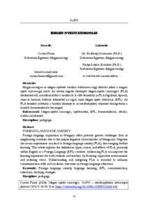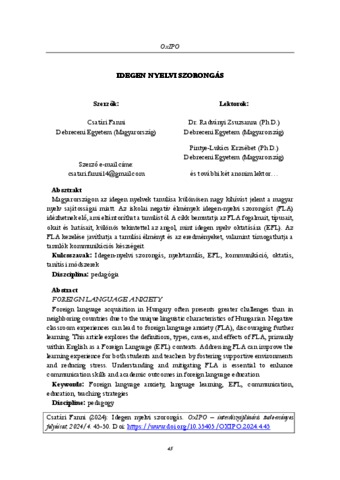 Magyarországon az idegen nyelvek tanulása különösen nagy kihívást jelent a magyar nyelv sajátosságai miatt. Az iskolai negatív élmények idegen-nyelvi szorongást (FLA) idézhetnek elő, ami eltántoríthat a tanulástól. A cikk bemutatja az FLA fogalmait, típusait, okait és hatásait, különös tekintettel az angol, mint idegen nyelv oktatására (EFL). Az FLA kezelése javíthatja a tanulási élményt és az eredményeket, valamint támogathatja a tanulók kommunikációs készségeit. | Foreign language acquisition in Hungary often presents greater challenges than in neighboring countries due to the unique linguistic characteristics of Hungarian. Negative classroom experiences can lead to foreign language anxiety (FLA), discouraging further learning. This article explores the definitions, types, causes, and effects of FLA, primarily within English as a Foreign Language (EFL) contexts. Addressing FLA can improve the learning experience for both students and teachers by fostering supportive environments and reducing stress. Understanding and mitigating FLA is essential to enhance communication skills and academic outcomes in foreign language education.