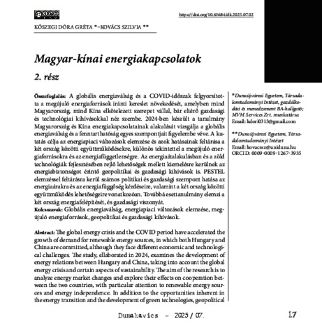 A globális energiaválság és a COVID-időszak felgyorsította a megújuló energiaforrások iránti kereslet növekedését, amelyben mind Magyarország, mind Kína elkötelezett szerepet vállal, bár eltérő gazdasági és technológiai kihívásokkal néz szembe. 2024-ben készült a tanulmány Magyarország és Kína energiakapcsolatainak alakulását vizsgálja a globális energiaválság és a fenntarthatóság egyes szempontjait figyelembe véve. A kutatás célja az energiapiaci változások elemzése és azok hatásainak feltárása a két ország közötti együttműködésekre, különös tekintettel a megújuló energiaforrásokra és az energiafüggetlenségre. Az energiaátalakulásban és a zöld technológiák fejlesztésében rejlő lehetőségek mellett kiemelésre kerülnek az energiabiztonságot érintő geopolitikai és gazdasági kihívások is. PESTEL elemzéssel feltárásra kerül számos politikai és gazdasági szempont hatása az energiaárakra és az energiafüggőség kérdéseire, valamint a két ország közötti együttműködés lehetőségeire vonatkozóan. Továbbá esettanulmány elemzi a két ország energiafelépítését, és gazdasági viszonyát.