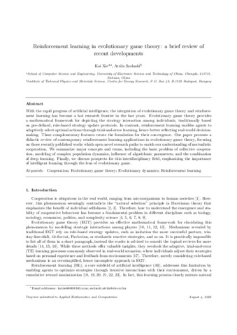 Kai, Xie and Szolnoki, Attila (2025) Reinforcement learning in evolutionary game theory: A brief review of recent developments. APPLIED MATHEMATICS AND COMPUTATION, 510. ISSN 0096-3003 (In Press)