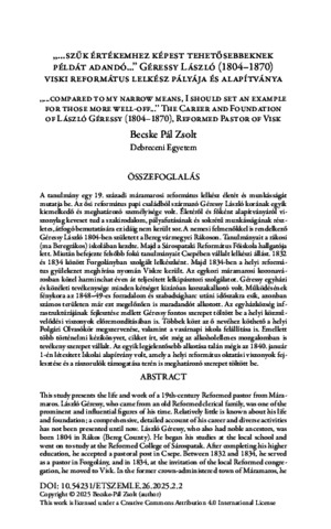 Becskei, Pál Zsolt (2025) ,,…szűk értékemhez képest tehetősebbeknek példát adandó...’’ Géressy László (1804 –1870) viski református lelkész pályája és alapítványa = ,,...compared to my narrow value, I should set an example for those who are more wealthy...’’ The career and foundation of László Géressy (1804–1870), a reformed pastor of Visk. EGYHÁZTÖRTÉNETI SZEMLE : TUDOMÁNYOS FOLYÓIRAT, 26 (2). pp. 35-83. ISSN 1585-7476 (nyomtatott); 1587-026X (elektronikus)