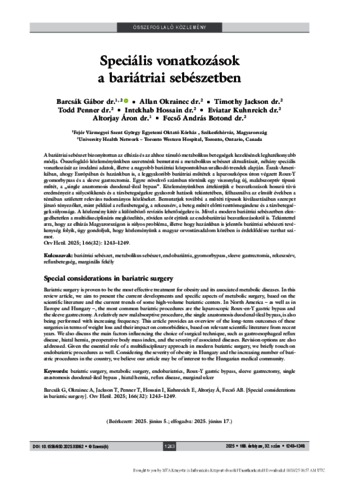 Barcsák, Gábor and Okrainec, Allan and Jackson, Timothy and Penner, Todd and Hossain, Intekhab and Kuhnreich, Eviatar and Altorjay, Áron and Fecső, András Botond (2025) Speciális vonatkozások a bariátriai sebészetben = Special considerations in bariatric surgery. ORVOSI HETILAP, 166 (32). pp. 1243-1249. ISSN 0030-6002
