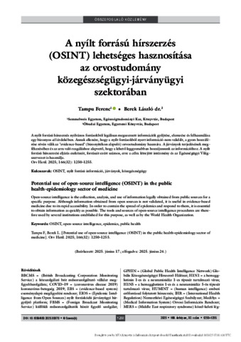 A nyílt forrású hírszerzés nyilvános forrásokból legálisan megszerzett információk gyűjtése, elemzése és felhasználása egy bizonyos cél érdekében. Annak ellenére, hogy a nyílt forrásokból nyert információ nem validált, a gyors hozzáférése révén válik az ’evidence-based’ (bizonyítékon alapuló) orvostudomány hasznára. A járványok terjedésének megfékezéséhez és az arra való reagáláshoz alapvető, hogy a lehető leggyorsabban hozzájussunk az információhoz. A nyílt forrású hírszerzési eljárás eszközeit, forrásait ezért számos, erre a célra létrejött intézmény és az Egészségügyi Világszervezet is használja. Orv Hetil. 2025; 166(32): 1250–1255. | Open-source intelligence is the collection, analysis, and use of information legally obtained from public sources for a specific purpose. Although information obtained from open sources is not validated, it is useful in evidence-based medicine due to its rapid accessibility. In order to contain the spread of epidemics and respond to them, it is essential to obtain information as quickly as possible. The tools and sources of open-source intelligence procedures are therefore used by several institutions established for this purpose, as well as by the World Health Organization. Orv Hetil. 2025; 166(32): 1250–1255.