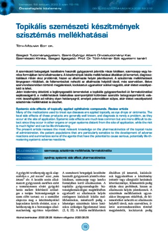 A szemészeti betegségek kezelésére használt gyógyszerek jelentős része lokálisan, szemcsepp vagy kenőcs formájában kerül alkalmazásra. A készítmények lokális mellékhatásai általában jól ismertek, diagnosztizálásuk ritkán okoz problémát, hiszen az alkalmazás helyén jelentkeznek. A szisztémás mellékhatások lényegesen ritkábbak, de felismerésüket nehezíti az alkalmazás helyétől távoli, más szervekben, illetve szervrendszerekben történő megjelenésük, kockázatuk ugyanakkor sokkal nagyobb, akár életet veszélyeztető is lehet. Jelen közlemény áttekinti a leglényegesebb ismereteket a topikális gyógyszerbeviteli út farmakokinetikai sajátosságairól, a mellékhatások kialakulása szempontjából különösen szenzitív betegcsoportokról, valamint összefoglalót ad néhány olyan hatóanyagról, amelyek potenciálisan súlyos, akár életet veszélyeztető szisztémás mellékhatást is okozhat. | Many of the medications used to treat eye diseases are applied topically, as eye drops or ointments. The local side effects of these products are generally well known, and diagnosis is rarely a problem, as they occur at the site of application. Systemic side effects are much less common but are more difficult to detect since they occur in other organs or organ systems distant from the site of application, while the risk is much higher and can be life-threatening. The present article reviews the most relevant knowledge on the pharmacokinetics of the topical route of administration, the patient populations that are particularly sensitive to the development of adverse reactions and summarizes some of the agents that have the potential to cause serious, potentially life-threatening systemic adverse reactions.