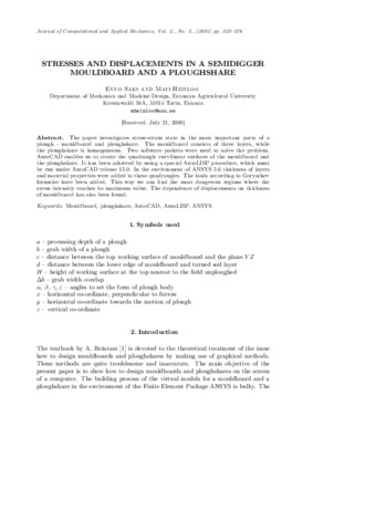 Saks, Enno and Heinloo, Mati (2001) Stresses and displacements in a semidigger mouldboard and a ploughshare. JOURNAL OF COMPUTATIONAL AND APPLIED MECHANICS, 2 (2). pp. 223-236. ISSN 1586-2070