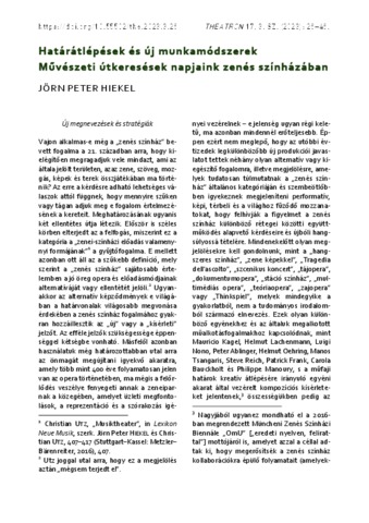 Hiekel, Jörn Peter and Csobó, Péter György (ford.) (2023) Határátlépések és új munkamódszerek : Művészeti útkeresések napjaink zenés színházában. THEATRON : SZÍNHÁZTUDOMÁNYI PERIODIKA, 17 (3). pp. 26-46. ISSN 1418-9941 (nyomtatott); 2732-1770 (elektronikus)