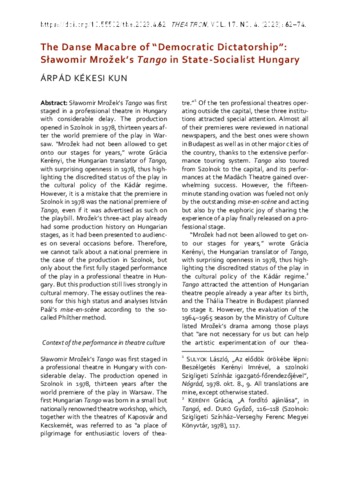 Kékesi-Kun, Árpád (2023) The Danse Macabre of "Democratic Dictatorship": Sławomir Mrożek's "Tango" in State-Socialist Hungary. THEATRON : SZÍNHÁZTUDOMÁNYI PERIODIKA, 17 (4). pp. 62-74. ISSN 1418-9941 (nyomtatott); 2732-1770 (elektronikus)
