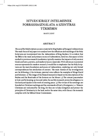 Bakti, Judit (2022) István király Intelmeinek forráshasználata a Szentírás tükrében. VALLÁSTUDOMÁNYI SZEMLE, 18 (2). pp. 86-111. ISSN 1786-4062 (nyomtatott); 2939-6336 (elektronikus)