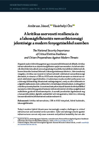 Ambrusz, József and Vásárhelyi, Örs (2025) A kritikus szervezeti reziliencia és a lakosságfelkészítés nemzetbiztonsági jelentősége a modern fenyegetésekkel szemben. NEMZETBIZTONSÁGI SZEMLE (ONLINE), 13 (2). pp. 74-93. ISSN 2064-3756