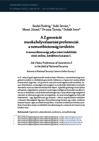 Szabó, Hedvig and Solti, István and Mezei, József and Drusza, Tamás and Dobák, Imre (2025) A Z generáció munkahelyválasztási preferenciái a nemzetbiztonság területén : A nemzetbiztonsági pálya iránti érdeklődés című online, kérdőíves kutatás 1. NEMZETBIZTONSÁGI SZEMLE (ONLINE), 13 (2). pp. 94-107. ISSN 2064-3756
