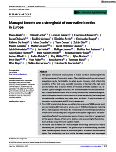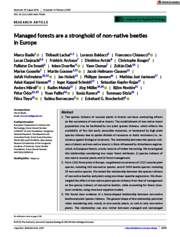 Basile, Marco and Lachat, Thibault and Balducci, Lorenzo and Chianucci, Francesco and Chojnacki, Lucas and Archaux, Frédéric and Avtzis, Dimitrios and Bouget, Christophe and De Smedt, Pallieter and Doerfler, Inken and Dumas, Yann and Elek, Zoltán and Gosselin, Marion and Gossner, Martin and Heilmann‐Clausen, Jacob and Hofmeister, Jeňýk and Hošek, Jan and Janssen, Philippe and Just Justesen, Mathias and Hansen, Aslak Kappel and Schmidt, Inger Kappel and Kepfer‐Rojas, Sebastian and Mårell, Anders and Matula, Radim and Müller, Jörg and Nordén, Björn and Ódor, Péter and Paillet, Yoan and Ravera, Sonia and Sitzia, Tommaso and Tinya, Flóra and Burrascano, Sabina and Brockerhoff, Eckehard G. (2025) Managed forests are a stronghold of non‐native beetles in Europe. JOURNAL OF APPLIED ECOLOGY, 62 (5). pp. 1243-1257. ISSN 0021-8901