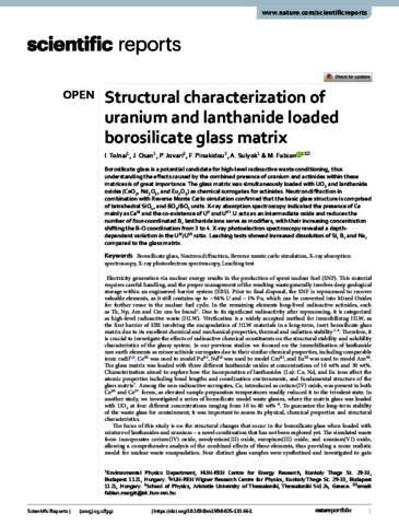 Tolnai, István and Osán, János and Jóvári, Pál and Pinakidou, F. and Sulyok, Attila and Fábián, Margit (2025) Structural characterization of uranium and lanthanide loaded borosilicate glass matrix. SCIENTIFIC REPORTS, 15 (1). No. 28352. ISSN 2045-2322