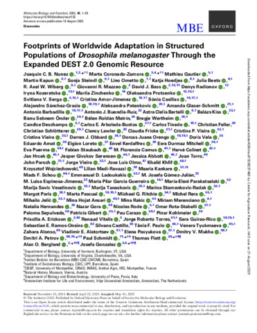 Nunez, Joaquin C B and Coronado-Zamora, Marta and Gautier, Mathieu and Kapun, Martin and Steindl, Sonja and Ometto, Lino and Hoedjes, Katja and Beets, Julia and Wiberg, R Axel W and Mazzeo, Giovanni R and Bass, David J and Radionov, Denys and Kozeretska, Iryna and Zinchenko, Mariia and Protsenko, Oleksandra and Serga, Svitlana V and Amor-Jimenez, Cristina and Casillas, Sònia and Sánchez-Gracia, Alejandro and Patenkovic, Aleksandra and Glaser-Schmitt, Amanda and Barbadilla, Antonio and Buendia-Ruíz, Antonio J and Bertelli, Astra Clelia and Kiss, Balázs and Önder, Banu Sebnem and Matrín, Bélen Roldán and Wertheim, Bregje and Deschamps, Candice and Arboleda-Bustos, Carlos E and Tinedo, Carlos and Feller, Christian and Schlötterer, Christian and Lawler, Clancy and Fricke, Claudia and Vieira, Cristina P. and Vieira, Cristina and Obbard, Darren J. and Orengo, Dorcas Juana and Vela, Doris and Amat, Eduardo and Loreto, Elgion and Kerdaffrec, Envel and Durmaz Mitchell, Esra and Puerma, Eva and Staubach, Fabian and Camus, M. Florencia and Colinet, Hervé and Hrcek, Jan and Sørensen, Jesper Givskov and Abbott, Jessica and Torro, Joan and Parsch, John and Vieira, Jorge and Olmo, Jose Luis and Khfif, Khalid and Wojciechowski, Krzysztof and Madi-Ravazzi, Lilian and Kankare, Maaria and Schou, Mads F and Ladoukakis, Emmanuel D. and Gómez-Julián, M. Josefa and Espinosa-Jimenez, M. Luisa and Garcia Guerreiro, Maria Pilar and Parakatselaki, Maria-Eleni and Veselinovic, Marija Savic and Tanaskovic, Marija and Stamenkovic-Radak, Marina and Paris, Margot and Pascual, Marta and Ritchie, Michael G. and Rera, Michel and Jelić, Mihailo and Hojat Ansari, Mina and Rakic, Mina and Merenciano, Miriam and Hernandes, Natalia and Gora, Nazar and Rode, Nicolas and Rota-Stabelli, Omar and Sepulveda, Paloma and Gibert, Patricia and Carazo, Pau and Kohlmeier, Pinar and Erickson, Priscilla A. and Vitalis, Renaud and Torres, Jorge Roberto and Guirao-Rico, Sara and Ramos-Onsins, Sebastian E. and Castillo, Silvana and Paulo, Tânia F and Tyukmaeva, Venera and Alonso, Zahara and Alatortsev, Vladimir E. and Pasyukova, Elena and Mukha, Dmitry V. and Petrov, Dmitri A. and Schmidt, Paul and Flatt, Thomas and Bergland, Alan O. and Gonzalez, Josefa (2025) Footprints of Worldwide Adaptation in Structured Populations of Drosophila melanogaster Through the Expanded DEST 2.0 Genomic Resource. MOLECULAR BIOLOGY AND EVOLUTION, 42 (8). pp. 1-28. ISSN 0737-4038