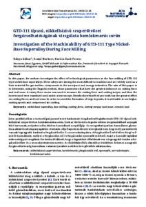 Jelen publikációban a technológiai paraméterek hatásainak vizsgálatával foglalkoztunk GTD-111 típusú nikkelbázisú szuperötvözet homlokmarása során. Ezek az ötvözetek a legnehezebben megmunkálható anyagok közé tartoznak, melyeket széles körben használnak a repülőgép- és energetikai iparban használatos gázturbina-alkatrészek alapanyagaként. A kutatás célja Taquchi-módszerrel meghatározni, hogy mely paraméterek vannak legnagyobb hatással a forgácsolóerőre és a szerszámkopásra. A forgácsolóerő méréséhez forgó erőmérőt használtunk, mellyel a forgácsolási erő és forgácsolási nyomaték mérhető, majd a használt lapkákat mikroszkóppal vizsgáltuk. Eredményül látható, hogy a fogankénti előtolásnak van a legnagyobb hatása a forgácsolóerőkre és a szerszám-tönkremenetelre. Az élrátétképződés elkerülése érdekében érdemes a nagyobb forgácsolósebesség használata, valamint javallott a sűrített levegős hűtés alkalmazása.