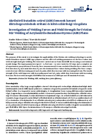 Stadler, Róbert Gábor and Horváth, Richárd (2023) Akrilnitril-butadién-sztirol (ABS) lemezek kavaró dörzshegesztésének erőtani és kötésszilárdsági vizsgálata. ACTA MATERIALIA TRANSYLVANICA (HU), 6 (1). pp. 53-58. ISSN 2601-1883