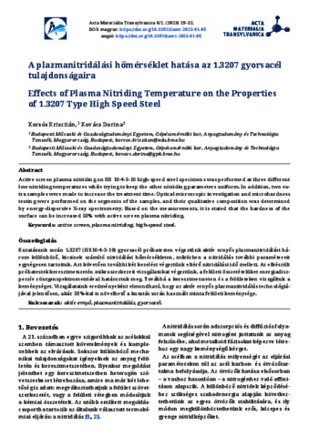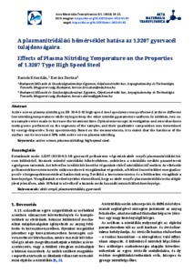 Kutatásunk során 1.3207 (HS10-4-3-10) gyorsacél próbatesten végeztünk aktív ernyős plazmanitridálást három különböző, kicsinek számító nitridálási hőmérsékleten, miközben a nitridálás további paramétereit egységesen tartottuk. Azt követően további két kezelést végeztünk eltérő nitridálási idő mellett. Az elkészült próbatestek keresztmetszetén mikroszerkezeti vizsgálatokat végeztünk, a felületi összetételüket energiadiszperzív röntgenspektrometriával határoztuk meg. Továbbá a keresztmetszeten és a felületeken vizsgáltuk a keménységet. Vizsgálataink eredményeként elmondható, hogy az aktív ernyős plazmanitridálás technológiájával jelentősen, akár 50%-kal is növelhető a kutatás során használt minta felületi keménysége.
